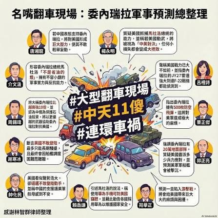 当时除了郭正亮,还有唐湘龙、栗正杰等多名政治立场亲蓝的“名嘴”认为,美国因为中美关系等因素,不可能对委内瑞拉采取军事行动。事后,他们因预测落空的言论被网民调侃为“中天11傻”(或称“蓝营名嘴11傻”)。