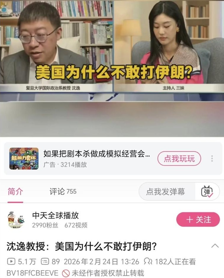 在美以对伊朗发动军事行动后,有网民将相关视频片段上传至B站,并配上“沈逸教授:美国为什么不敢打伊朗”的标题。这个视频截图随后在社媒广泛传播,“沈逸预测”一度登上热搜,引起网民讽刺“教授每次的准确预测真是惊为天人,我们有如此国师真的很感动”。